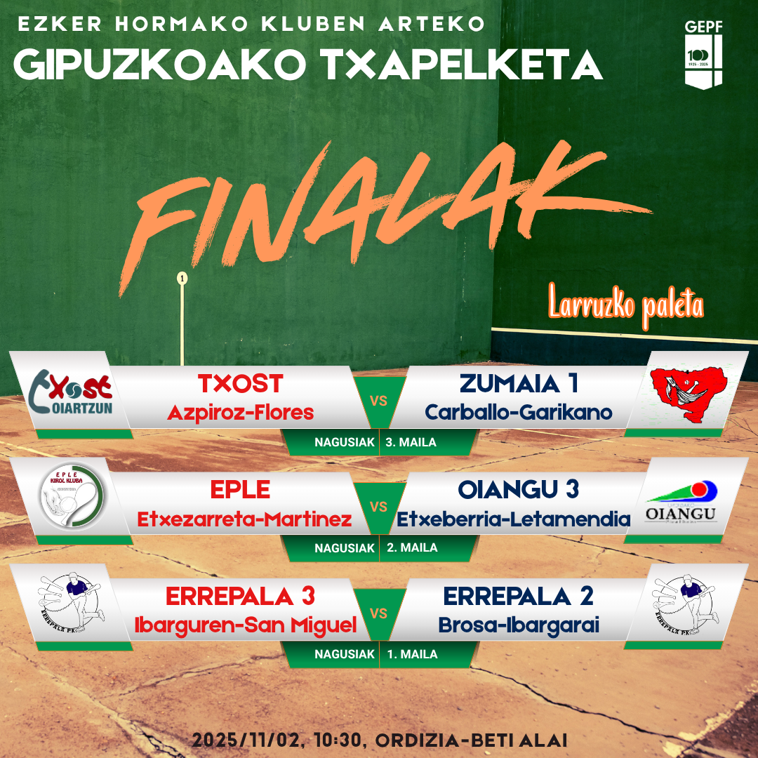 Ordizian jokatuko dituzte final hauek, igande goizean. Eta gure YouTube kanalean (https://www.youtube.com/@GipuzkoaPilotaEmankizunak) zuzenean ikusteko aukera izango da, gainera, esteka honetan klikatuta: https://youtube.com/live/Yfhmtk7wLHY?feature=share. Hauxe izango da jaialdia: